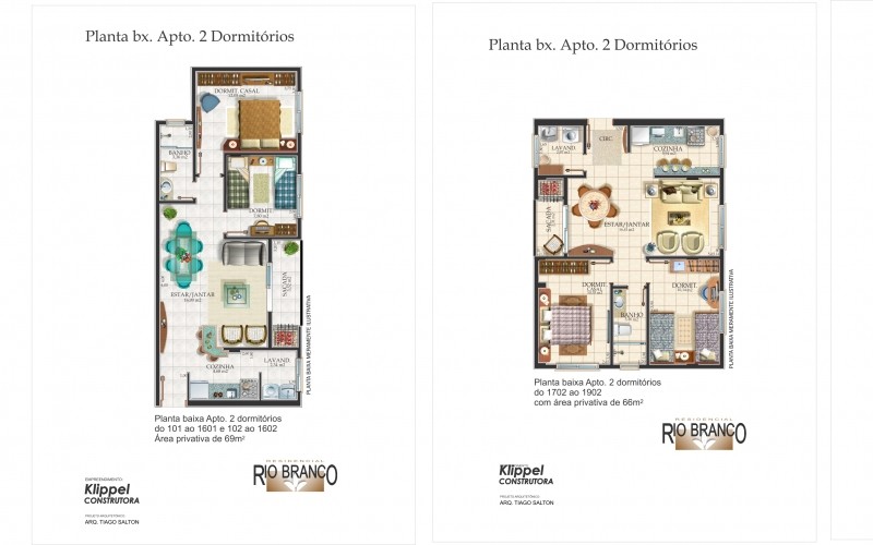 Apartamentos de 1 e 2 dormitórios, de 48m² e 66m², cozinha, sala de jantar e estar, banheiro social, sacada, churrasqueira, box e elevador.