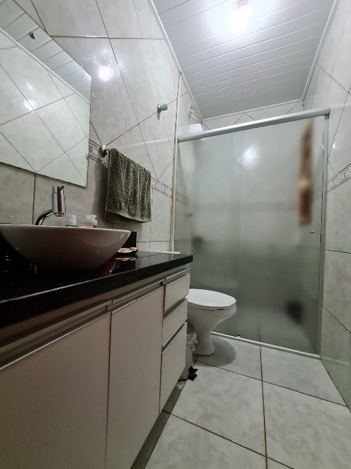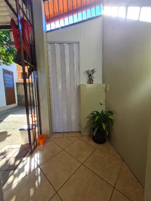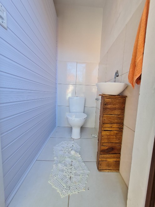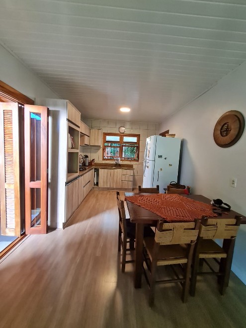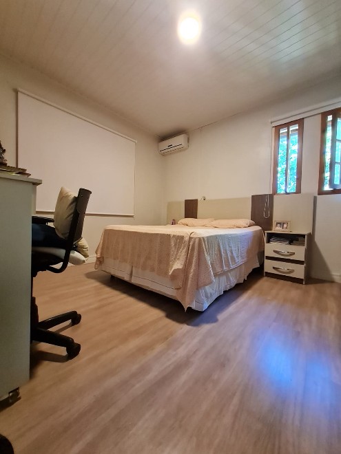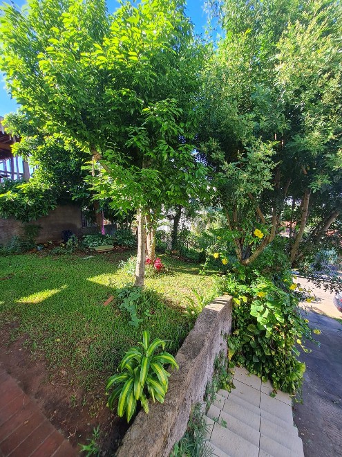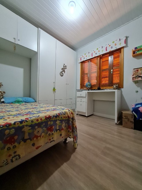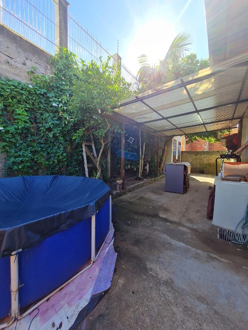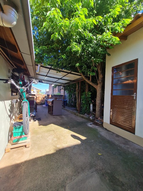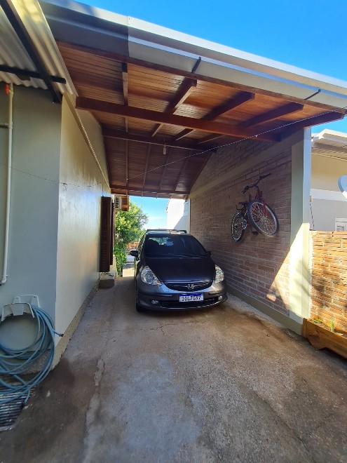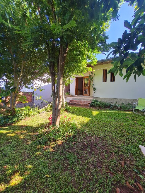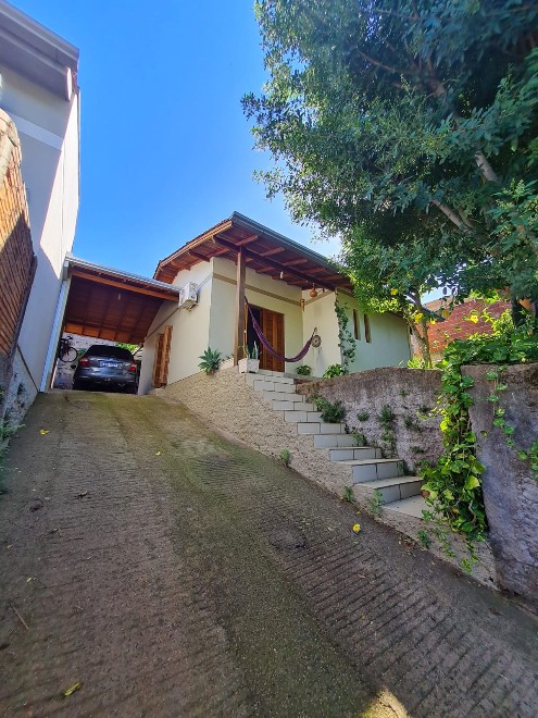 Bela casa em alvenaria, são 74m² de área construída, sendo 2 dormitórios, cozinha, sala de estar e jantar em conceito aberto, banheiro social, piso laminado, garagem, área coberta nos fundos, com churrasqueira e banheiro. Ficam móveis sob medida. Terreno com metragem de 300m² (12×25), bem arborizado, localizado na parte mais alta do Solar do Campo, com bela vista da cidade. Possui portão e eletrônico e poço artesiano. Avalia sítio em Lomba Grande.