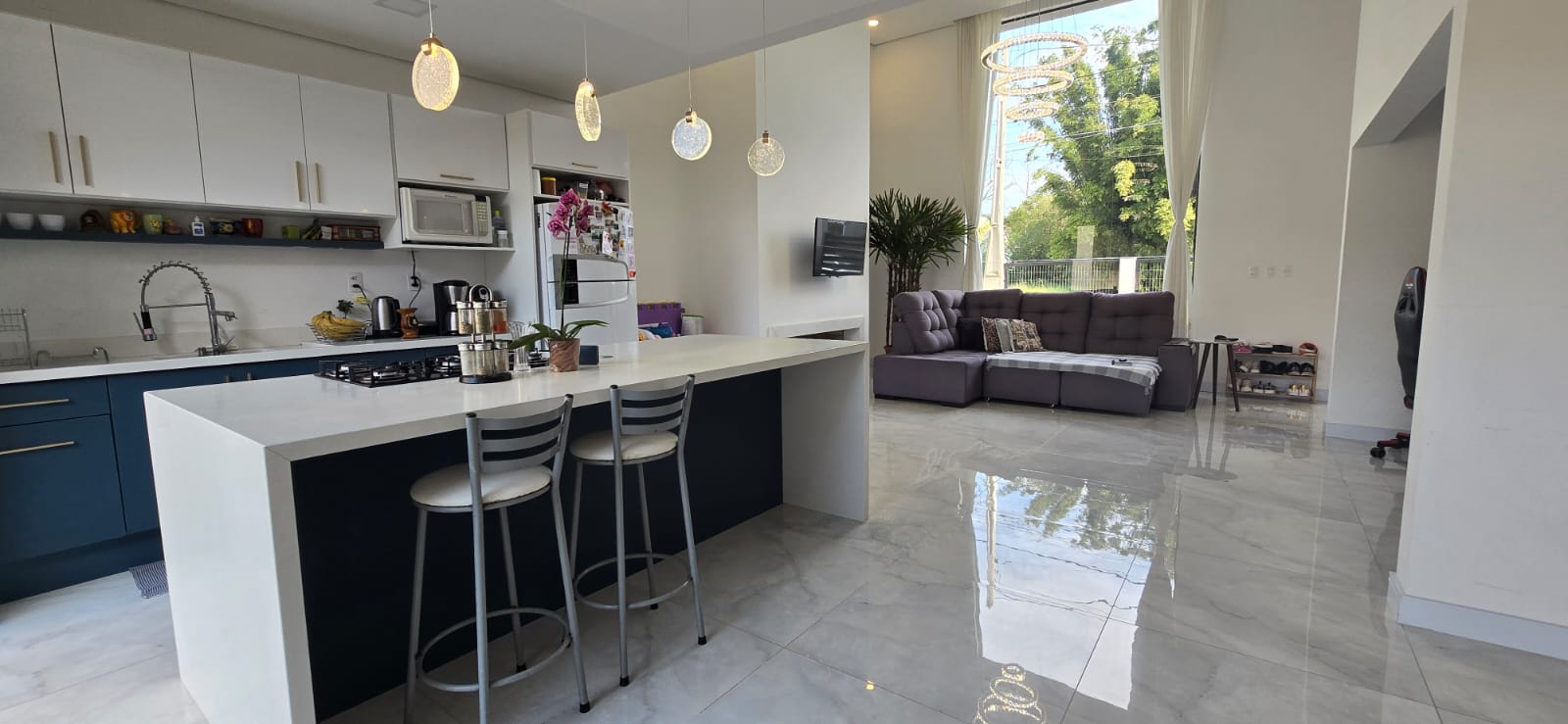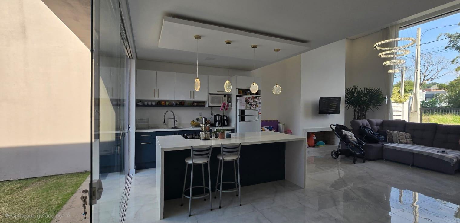 A sala de estar conta com uma lareira charmosa, que se integra ao ambiente, criando um espaço acolhedor para os dias mais frios. A cozinha em conceito aberto, com ilha central, é perfeita para quem gosta de praticidade sem abrir mão de elegância.