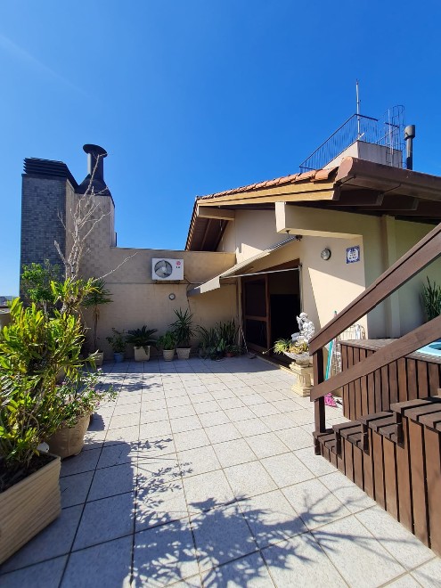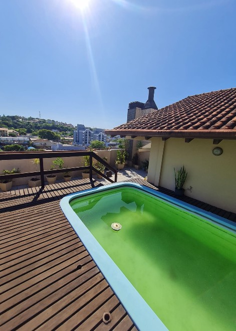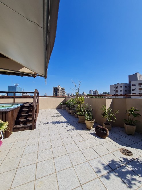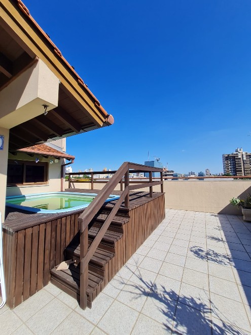 Cobertura com 236m² privativos, possuindo 3 dormitórios, sendo 1 suíte, todos com ar condicionado, 2 banheiros sociais, lavabo, sala de estar e jantar,sacada, cozinha ampla, lavanderia. Maravilhoso espaço de lazer com sala com lareira e churrasqueira. Terraço com piscina, deck em madeira e vista para a cidade. Duas vagas de garagem cobertas. O prédio possui elevador, porteiro eletrônico, bicicletário e poço artesiano.  Agende sua visita!