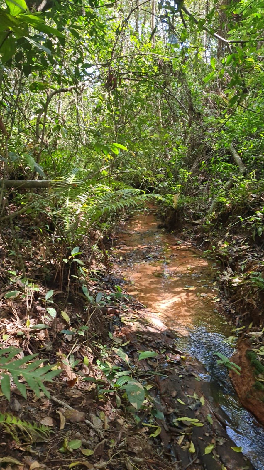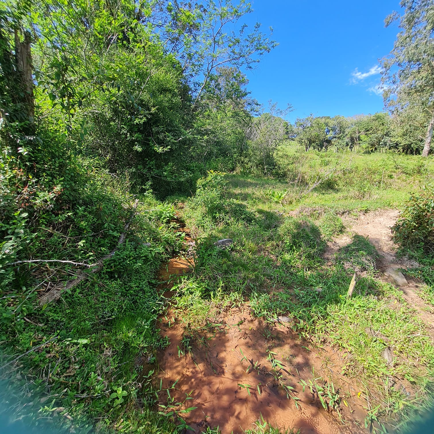 Um riacho com águas cristalinas, vertentes e mata nativa compõem a paisagem.