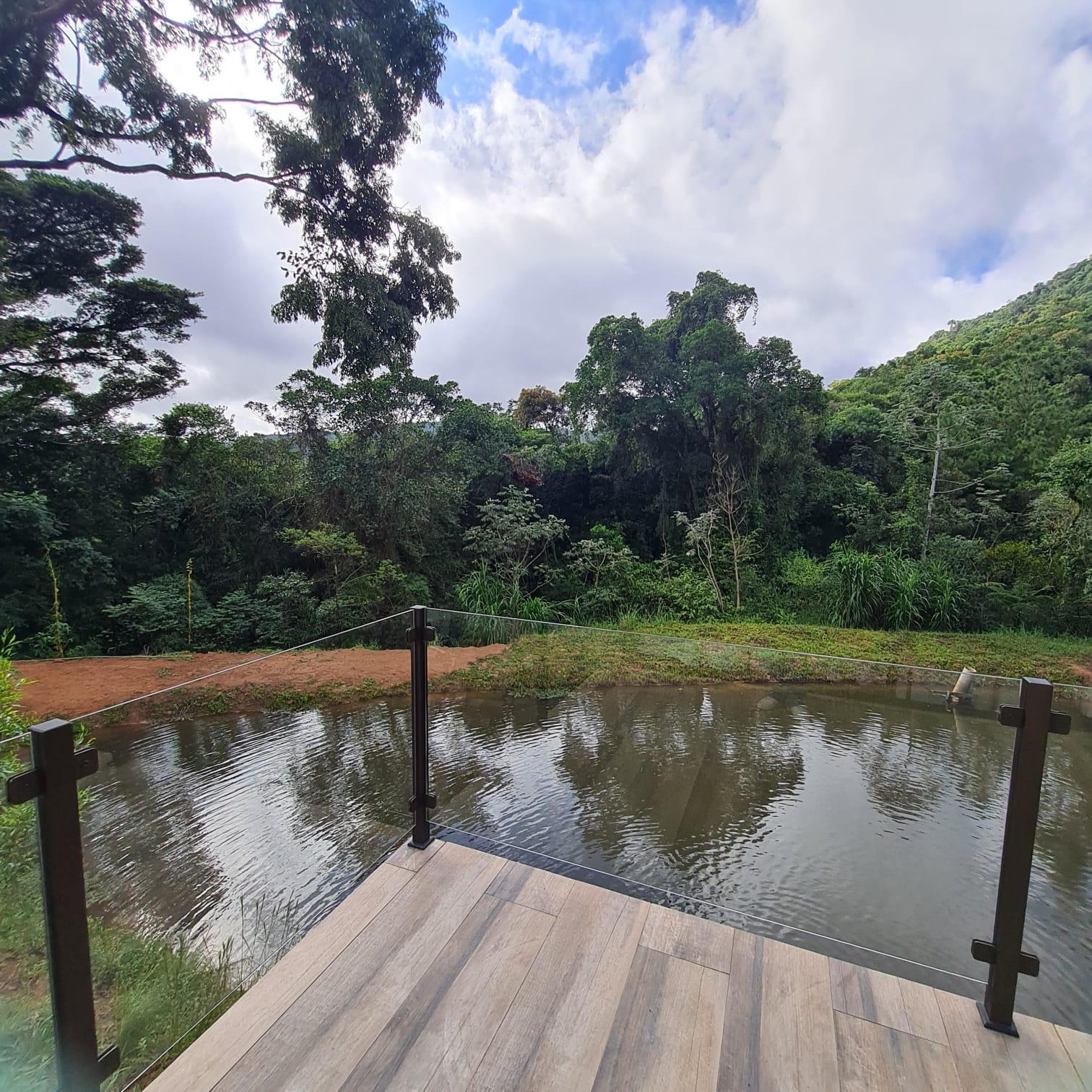 A sala e cozinha são em conceito aberto e contam com um belo fogão campeiro, churrasqueira e deck suspenso com linda vista para o açude.